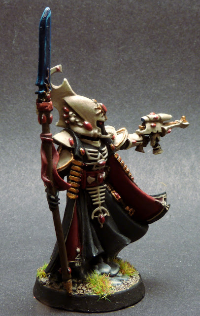I kept the figure to the same palette as my Guardian squad - black, bone and red, with a little blue on the singing spear. I went for a slightly above tabletop quality paint job, since it's a character model.